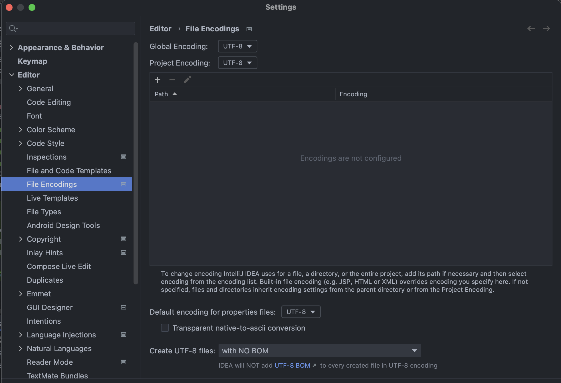 위의 메시지 properties를 테스트하는 과정에서 한글 인코딩 문제가 발생할 수 있는데 이 경우에는 IDE에서 encoding setting을 utf-8로 바꿔주면 해결된다.