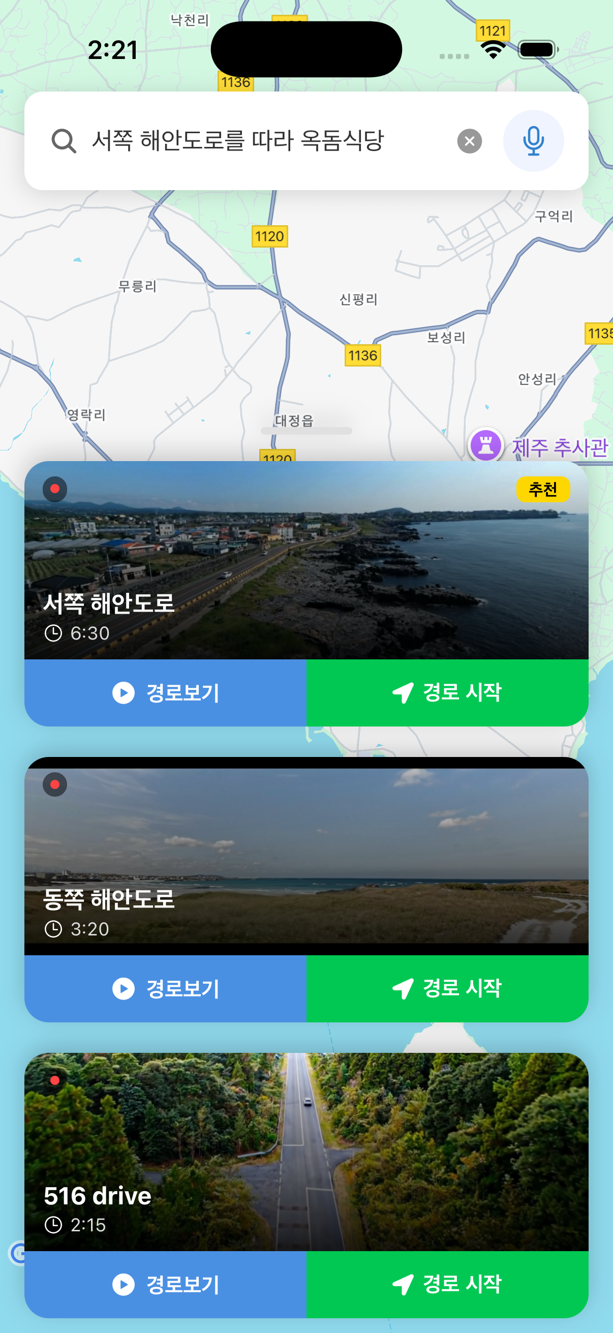 프로토타입의 플로우는 간단하다. 검색창에 검색하면 경로를 표현하는 프리뷰 영상이 나오고, 음성으로 검색해도 프리뷰 영상을 보여주고, 그 다음에 경로를 선택할 수 있게하는 방식이다. 디자인은 다음과 같이 구현했다.