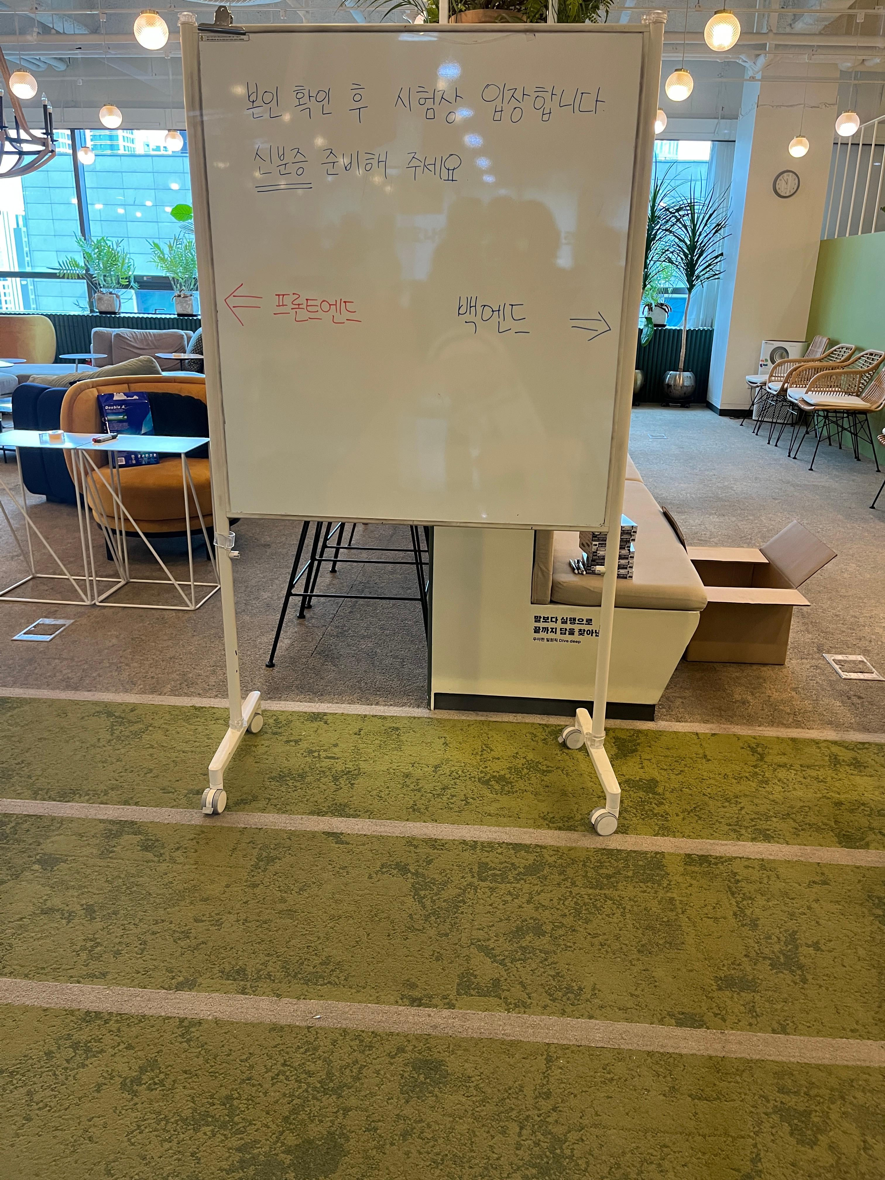 12시가 되자 코치분들이 문을 열어주셨고, 그때부터 신원 파악 및 자리 안내가 이어졌다. 테코톡에서나 봤을 법한(?) 공간들이 있었다. 마치 드라마 세트장에 온 것 같은 기분이었다. 근데 긴장되는게 더 커서 주변 볼 시간이 없었다... 화장실만 10번 간 듯;;;