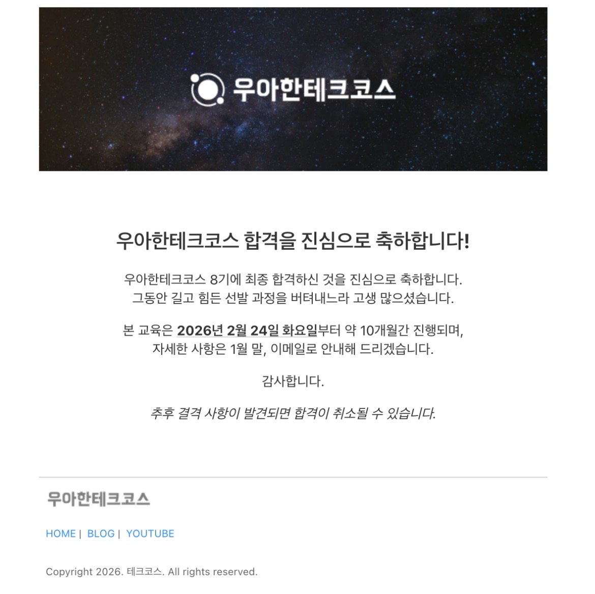 5주동안의 프리코스와 지원서 작성, 최종 코딩 테스트 과정을 모두 진행하고, 바들바들 떨고 있던 어제 할 일은 해야하기에 창업 프로젝트 미팅을 위해서 버스를 타고 출근을 하던 중 메일이 왔다.