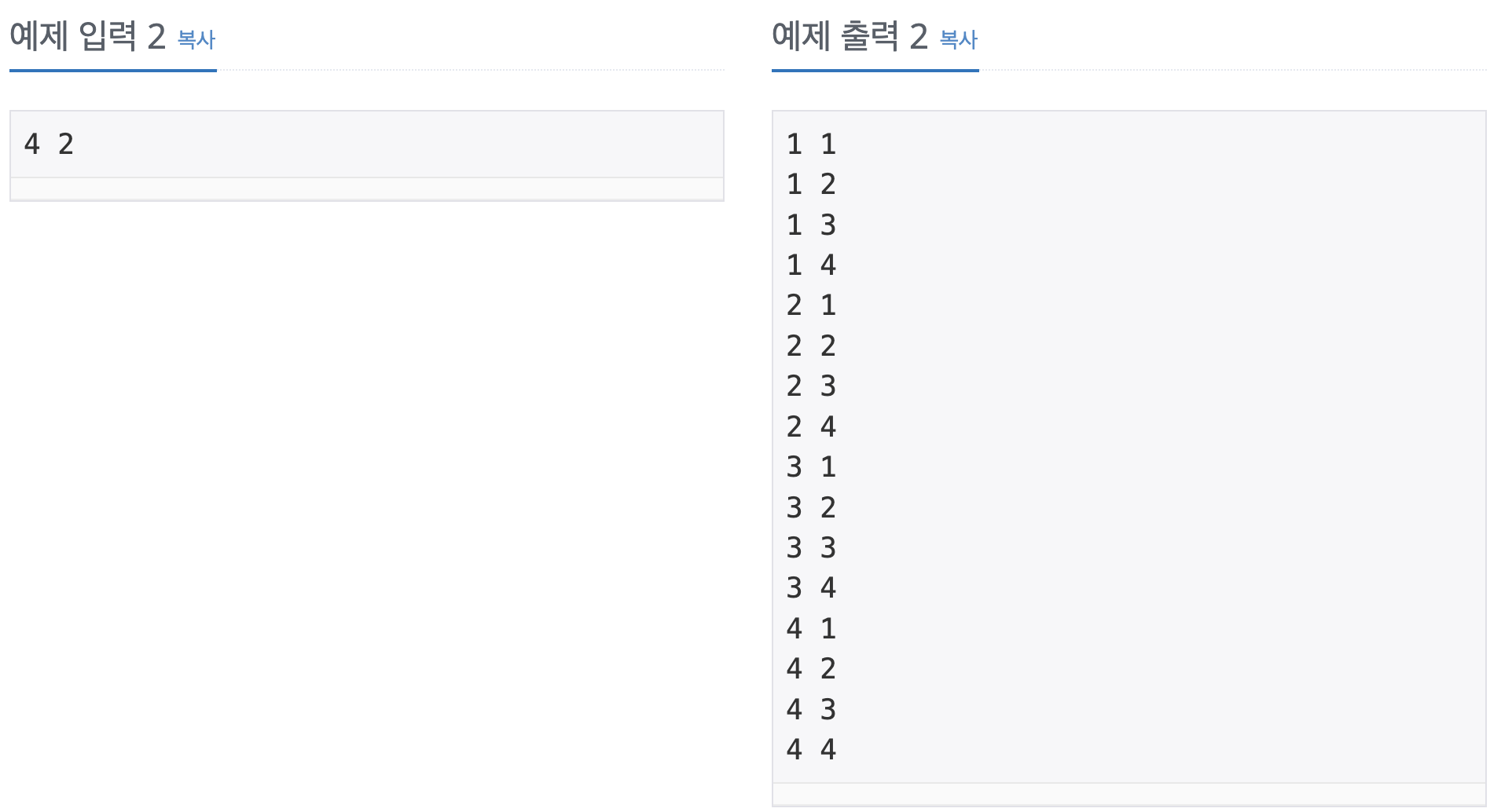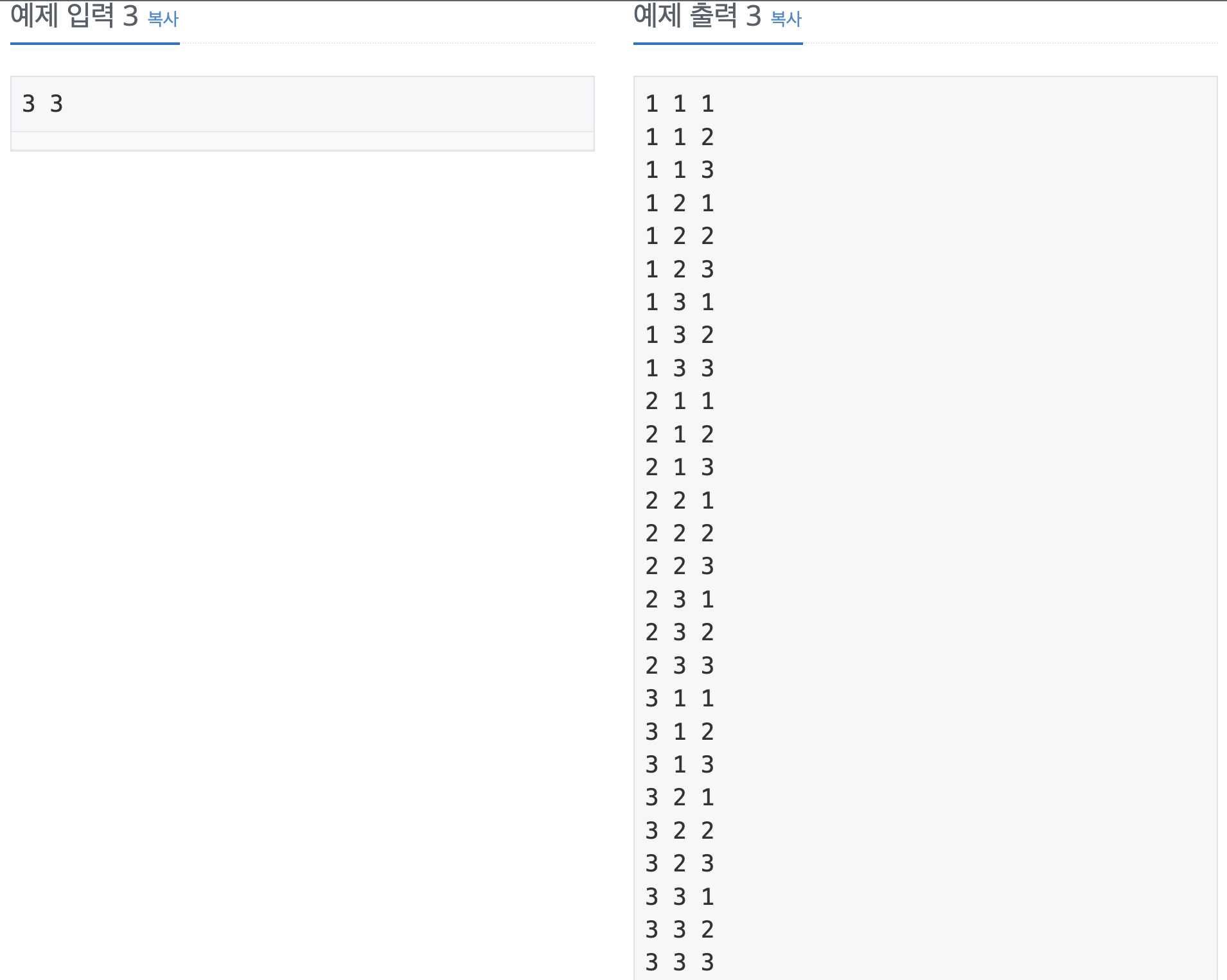 이 문제는 위의 15650번보다 훨씬 간단하다. 아래의 입출력을 보면 느낄 수 있을 것이다.