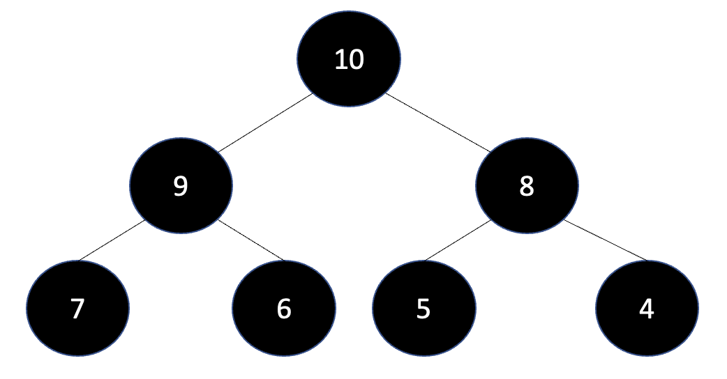 최대 힙의 경우 루트 노드를 기준으로 자식 노드들을 루트 노드보다 작은 값들로 구성하는 형태이다. 아래의 그림과 같은 형태라고 생각하면 된다.