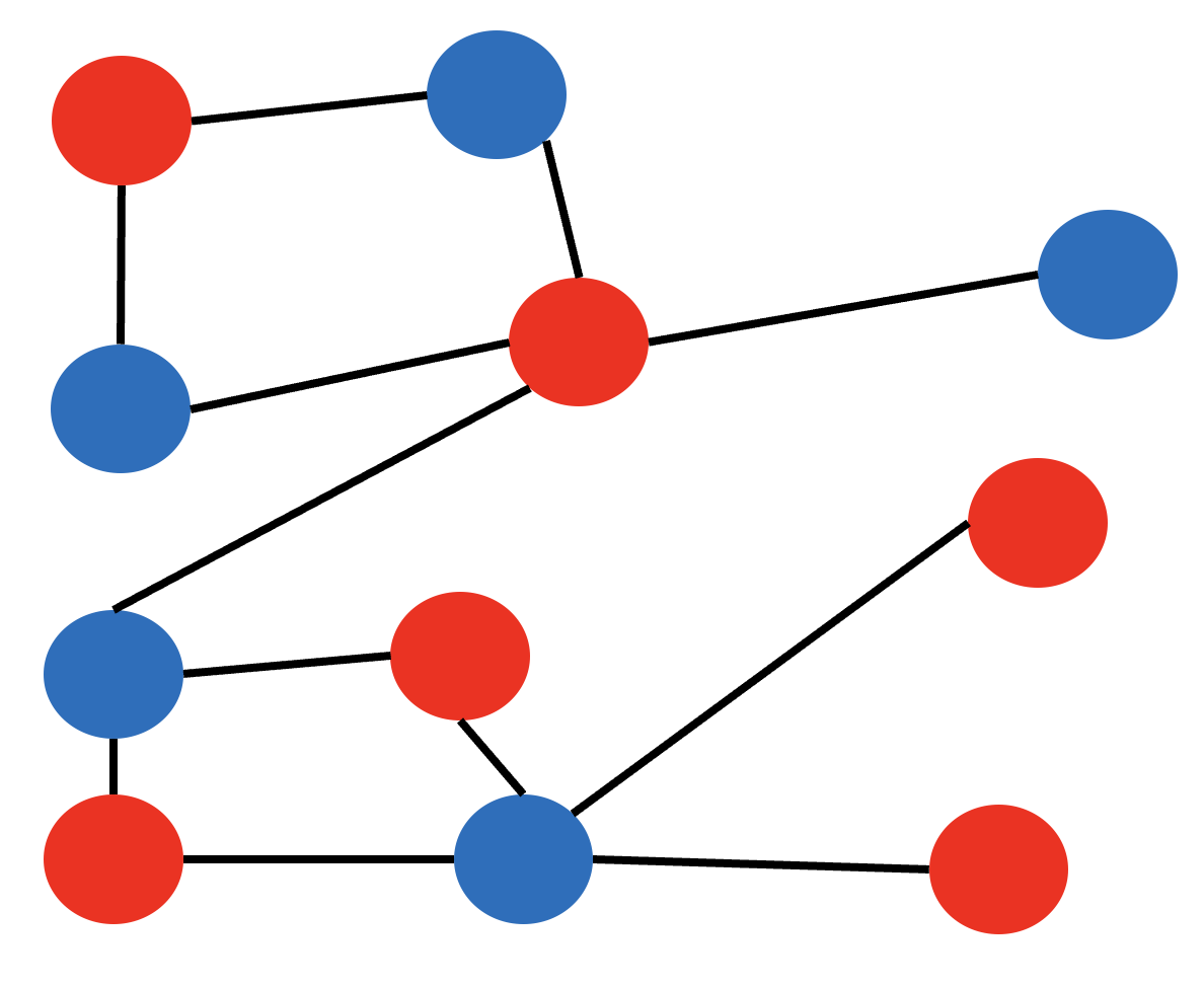 위 그림을 보면 붉은 점을 기준으로 보던 푸른 점을 기준으로 보던 인접한 노드의 색은 반대되는 색을 하고 있다는걸 확인할 수 있다.