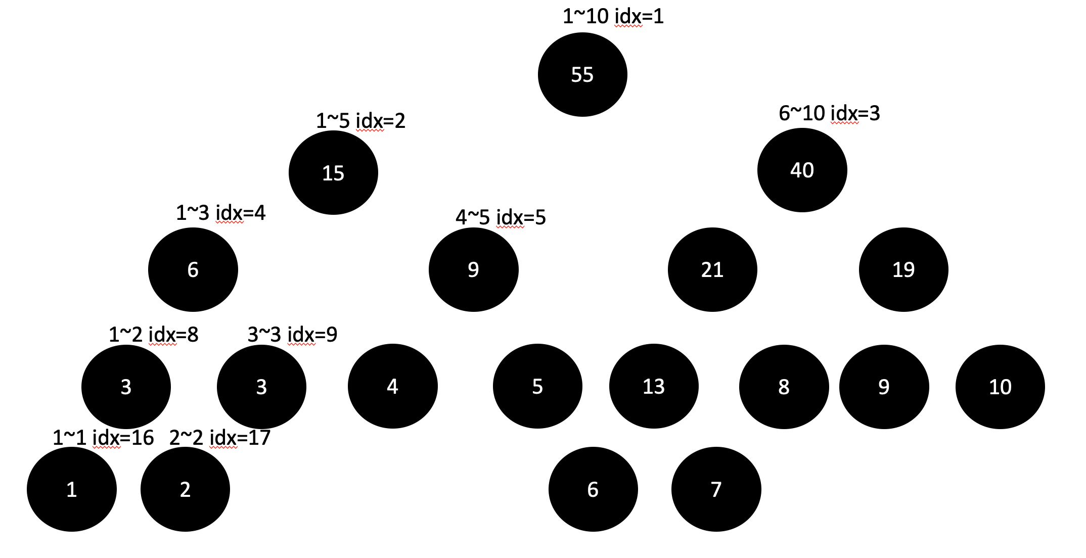 예를들어 1~10까지의 수가 있고 이중에서 몇몇 값들을 바꾸어서 구간의 합을 구하는 경우에 아래의 그림과 같은 세그트리를 만들 수 있다.