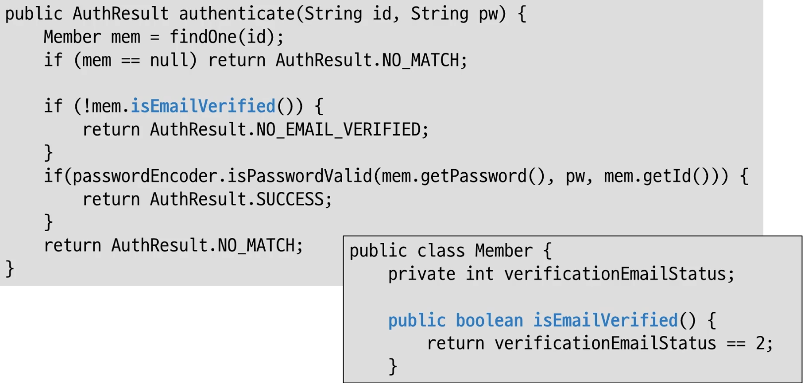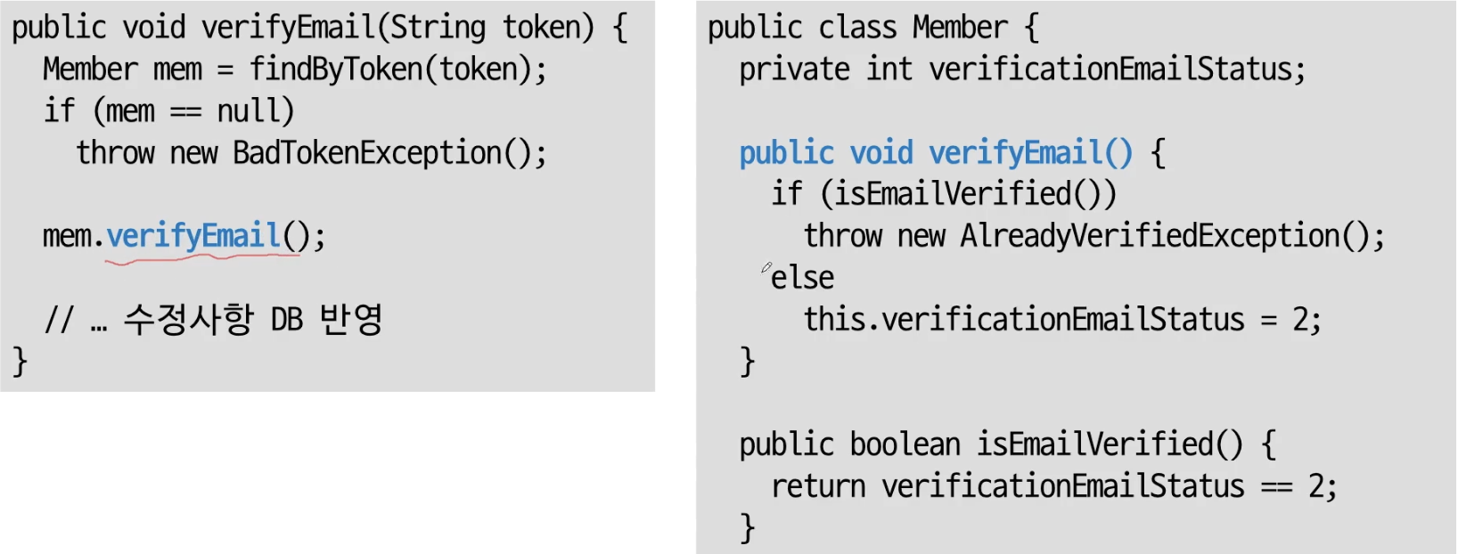 위의 코드같은 경우 if-else문으로 연결되어 email의 상태에 따라 처리방식이 있는 이런 경우에는 if-else문 자체를 묶어서 객체 내부의 메서드로 만든다. 추가적으로 if문의 코드도 tell don't ask의 방식으로 바꾸어준다. 이렇게되면 코드의 가독성도 올라간다.