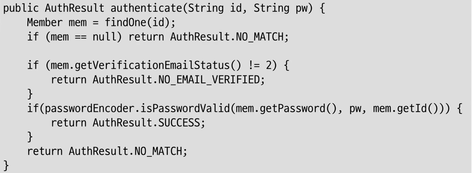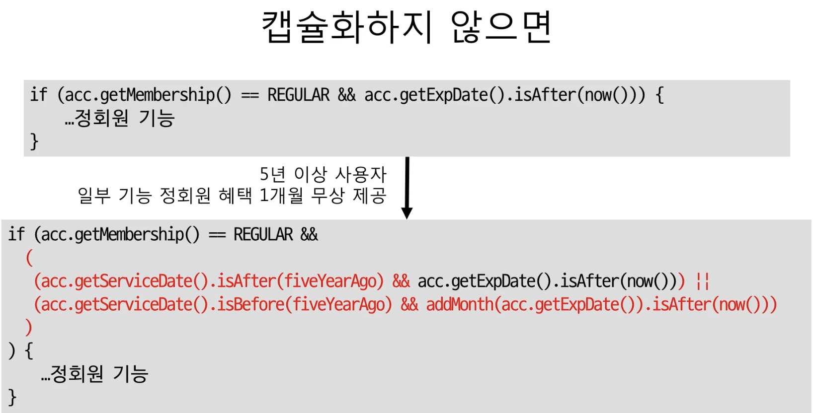 위의 코드는 특정 회원에게 부가 기능을 제공하기 위한 부분이다. 캡슐화를 하지 않아서 코드가 가독성이 떨어지고, 여러부분의 코드를 수정해야하는 상황이 발생하여 유지보수에 어려움이 생긴다.