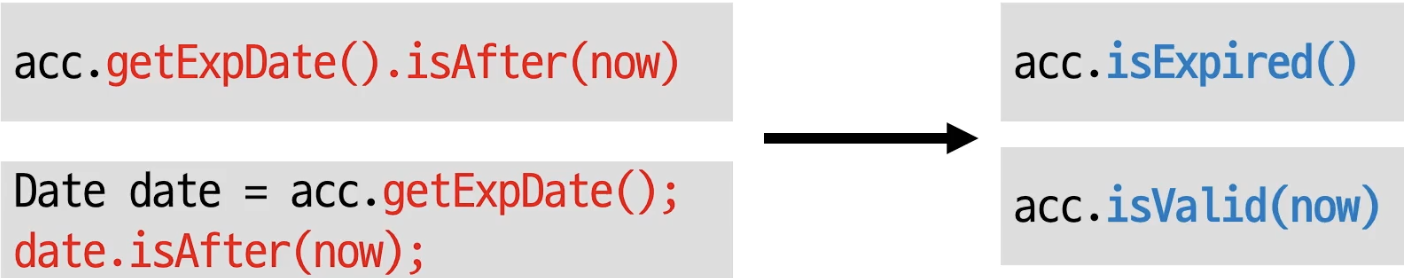 첫번째 규칙인 tell don't ask를 적용하여 값을 가져와서 처리하는 것이 아니라 객체 내부에서 처리하게 만들 수 있다.