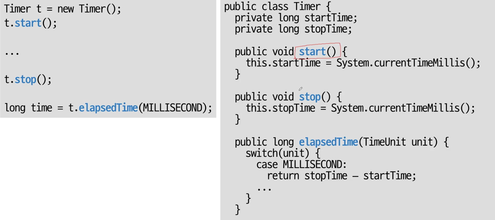 위의 예를 보면 코드의 확장성을 볼 수 있는데, 만약 MILLISECOND로 계산하던 시간을 NANOSECOND로 바꾸고 싶다면, 위의 코드에서 Timer의 메서드에 start부분과 stop부분에 NANOSECOND의 경우를 추가하고 파라미터로 필요한 데이터를 넘겨준다면,